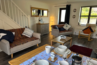 A welcome pack including milk, bread, eggs and orange juice to get your stay off to great start | Wood burning stove, Smart TV, sofas /chair, coffee table, dining table & french doors leading to the garden |